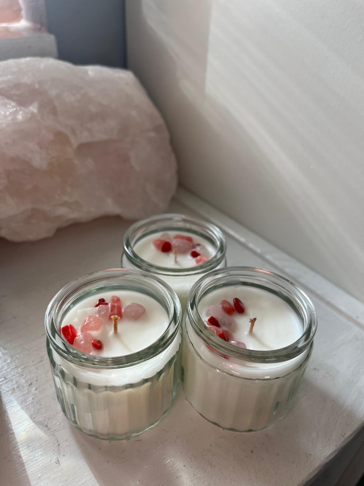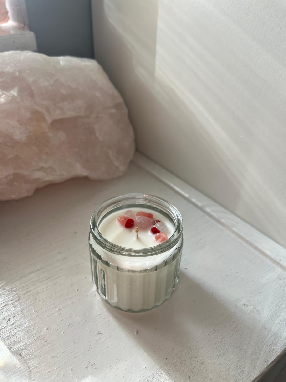 Liefde & Kracht – Geurkaars met Rozenkwarts & Rode Jaspis